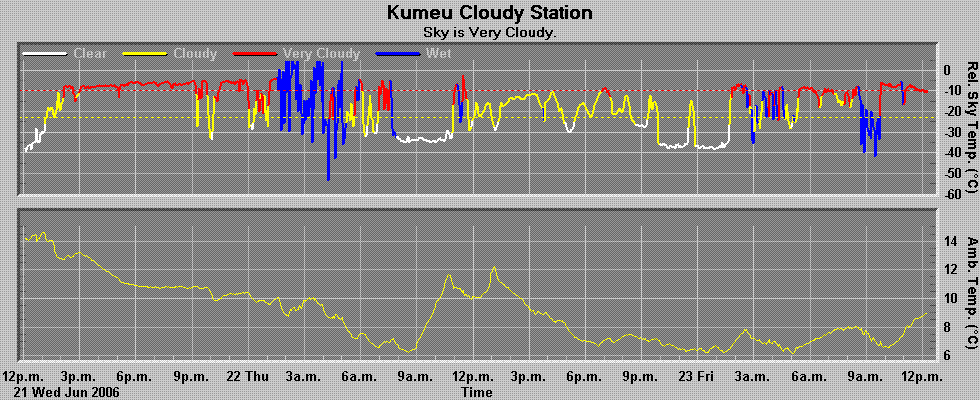 I have just installed a new Clear Sky Monitor from Diffraction Ltd below is the graph it is creating. This graph is updating roughly every three minutes. Hit F5 for refresh, to see the latest graph. It shows the cloud cover and ambient temperature. The cloud cover is measured by a non-contact thermometer looking at the sky.