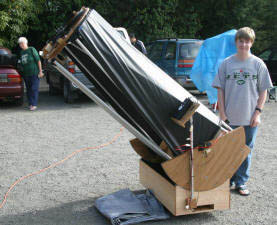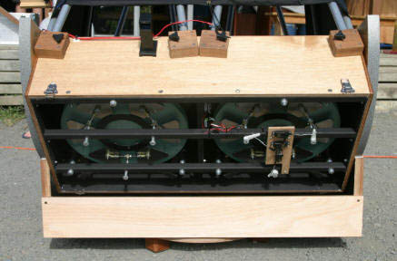 The second approach, the one that I have taken. Is to have the top end of the telescope and the bottom end completely rigid structures. The top end is two rings joined together and the mirror cell is one solid unit. This makes the whole structure move as one and any sag in any part is exactly the same on the other side keeping the optics aligned to each other. In order to make the optic paths parallel the primary mirrors are able to move in XY direction. They are also held firmly in place by piano wire edge supports, rather than that a traditional sling system. I am now convinced of the merits of this style of design compared with the independent tube idea. The entire structure is a rigid, the movement is smooth, it's rock solid with no vibration and easy for a number of users to view one after another with little or no adjustment. You do need a cool methodical approach to collimating this instrument but once it is achieved it is a pleasure to use.